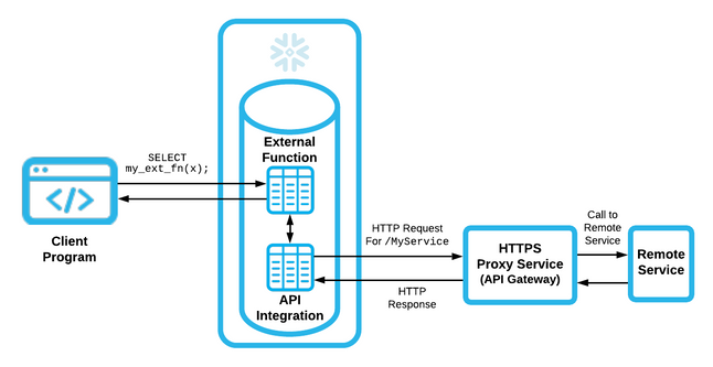 Although a native UDF in Snowflake is written in JavaScript, the external function is executed remotely and can be coded in any language the remote infrastructure supports. It is then coupled with an API integration in Snowflake to expose it as an external UDF. This integration sends the payload to be operated on to an API proxy service (an AWS API Gateway in this case). The Gateway then satisfies this request through the remote service behind it—a microservice backed by a container or by a Lambda piece of code.