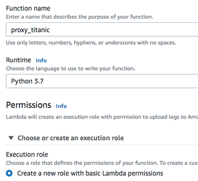 See the articles mentioned above for additional Lambda-creation workflows to gain familiarity with the environment and process. Create a Lambda named proxy_titanic with a Python 3.7 runtime environment.  Leverage an existing IAM role or create a new one with default execution permissions.