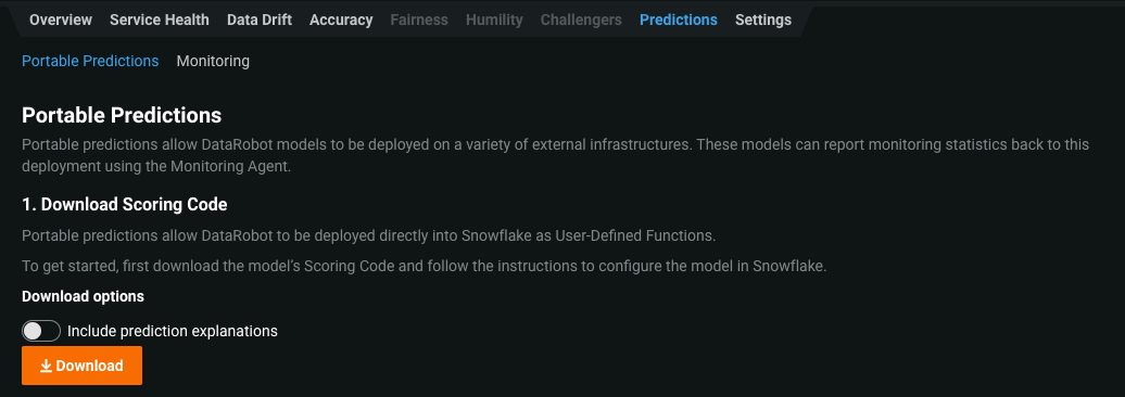 After deploying the model, access the deployment from the inventory and navigate to the Predictions > Portable Predictions tab. This is where DataRobot hosts the Scoring Code for the model.