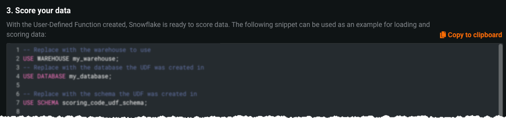 When the Scoring Code download completes, copy the installation script and update it with your Snowflake warehouse, database, schema, and the path to the Scoring Code JAR file, then execute the script.