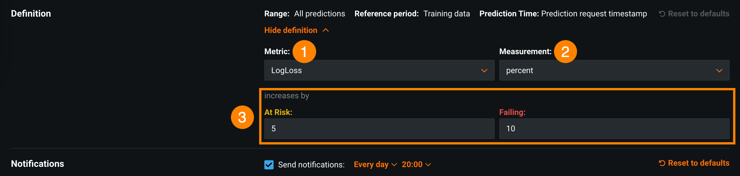 Element Description 1 Metric Defines the metric used to evaluate the accuracy of your deployment. The metrics available from the dropdown menu are the same as those supported by the Accuracy tab. 2 Measurement Defines the unit of measurement for the accuracy metric and its thresholds. You can select value or percent from the dropdown. The value option measures the metric and thresholds by specific values, and the percent option measures by percent changed. The percent option is unavailable for model deployments that don't have training data. 3 "At Risk" / "Failing" thresholds Sets the values or percentages that, when exceeded, trigger notifications. Two thresholds are supported: when the deployment's accuracy is "At Risk" and when it is "Failing." DataRobot provides default values for the thresholds of the first accuracy metric provided (LogLoss for classification and RMSE for regression deployments) based on the deployment's training data. Deployments without training data populate default threshold values based on their prediction data instead. If you change metrics, default values are not provided. Note