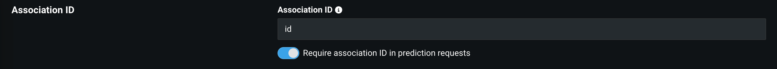 In addition, you can enable Require association ID in prediction requests to throw an error if the column is missing from your prediction dataset when you make a prediction request.