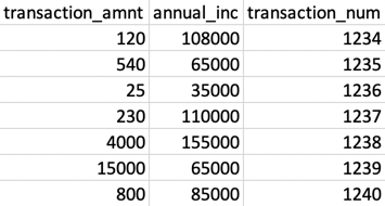 The third column, transaction_num, is the column containing the association IDs. A row's unique ID (transaction_num in this example) groups together the other features in that row (transaction_amnt and annual_inc in this example), creating an "association" between the related feature values. Defining transaction_num as the column containing association IDs allows DataRobot to use these unique IDs to associate each row of prediction data and predicted outcome with the actual outcome later. Therefore, transaction_num is what you would enter in the Association ID field when setting up accuracy.