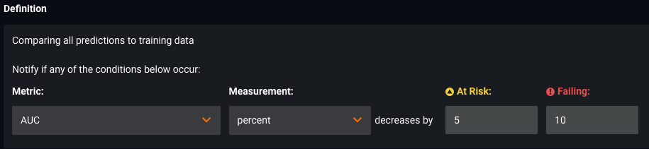 However, if you change the metric to AUC and the measurement to percent, the rule triggers notifications when accuracy "decreases by" the values set for the threshold: