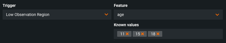 To configure the low observation region trigger, select a categorical feature and indicate one or more values. Any input value that appears in prediction requests that does not match the indicated values triggers an action.