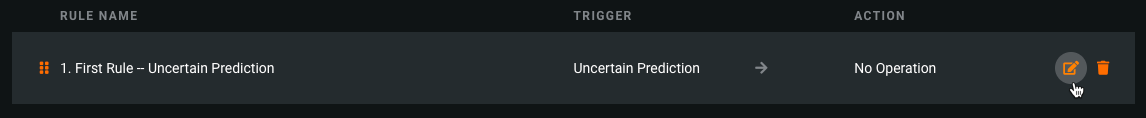 ) to enter a name for the rule. Then select a Trigger and specify an Action to take based on the selected trigger. The trigger detects a rule violation and the action handles the violating prediction.When rule configuration is complete, a rule explanation displays below the rule describing what happens for the configured trigger and respective action.