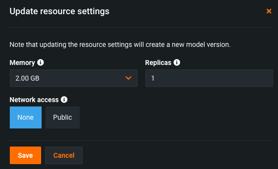 Click the edit icon and configure the custom model's resource allocation and network access settings in the Update resource settings dialog box:
