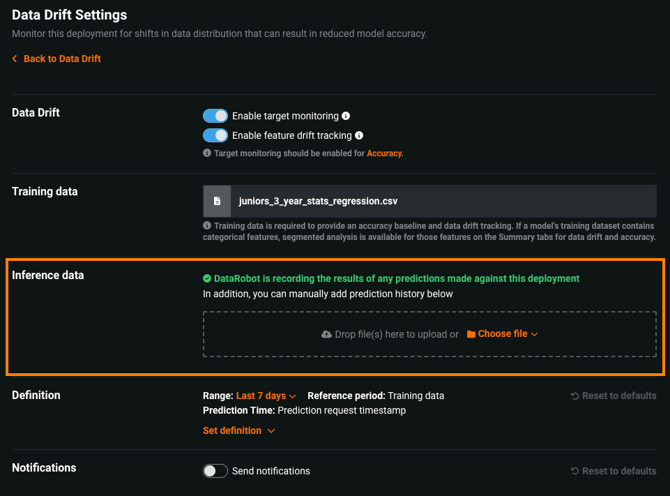 Users with the Owner role can add historical prediction data to external model deployments if data drift is enabled. To do so, navigate to the Data Drift > Settings tab and click Choose file in the Inference data section to upload your prediction data in XLSX, CSV, or TXT format. You can also select prediction data from the AI Catalog.