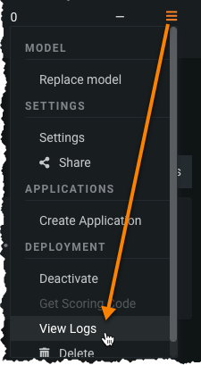 To view the logs for a deployed model, navigate to the deployment, open the Actions menu , and select View Logs.