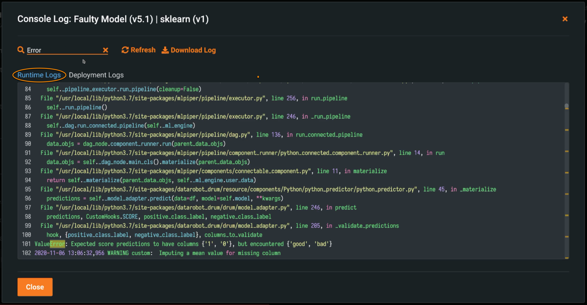 Runtime Logs are used to troubleshoot failed prediction requests (via the Predictions tab or the API). The logs are captured from the Docker container running the deployed custom model and contain up to 1MB of data. The logs are cached for 5 minutes after you make a prediction request. You can re-request the logs by clicking Refresh.