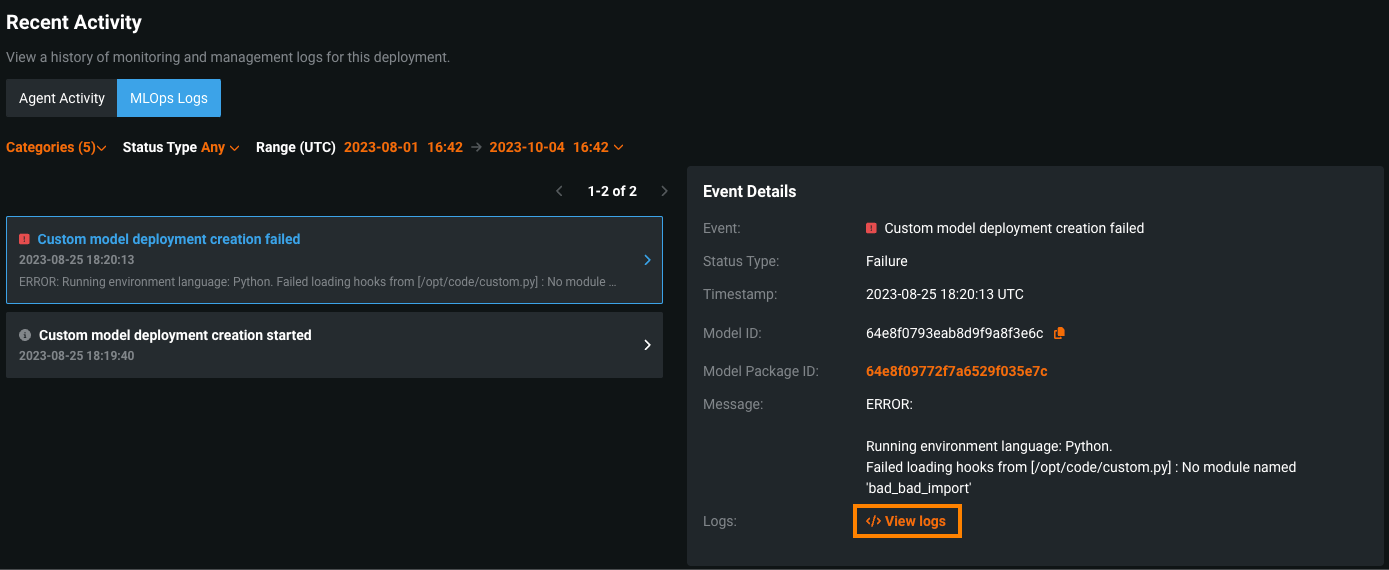 On the Service Health tab, under Recent Activity, you can click the MLOps Logs tab to view the Event Details. In the Event Details, you can click View logs to access the custom model deployment logs to diagnose the cause of the error: