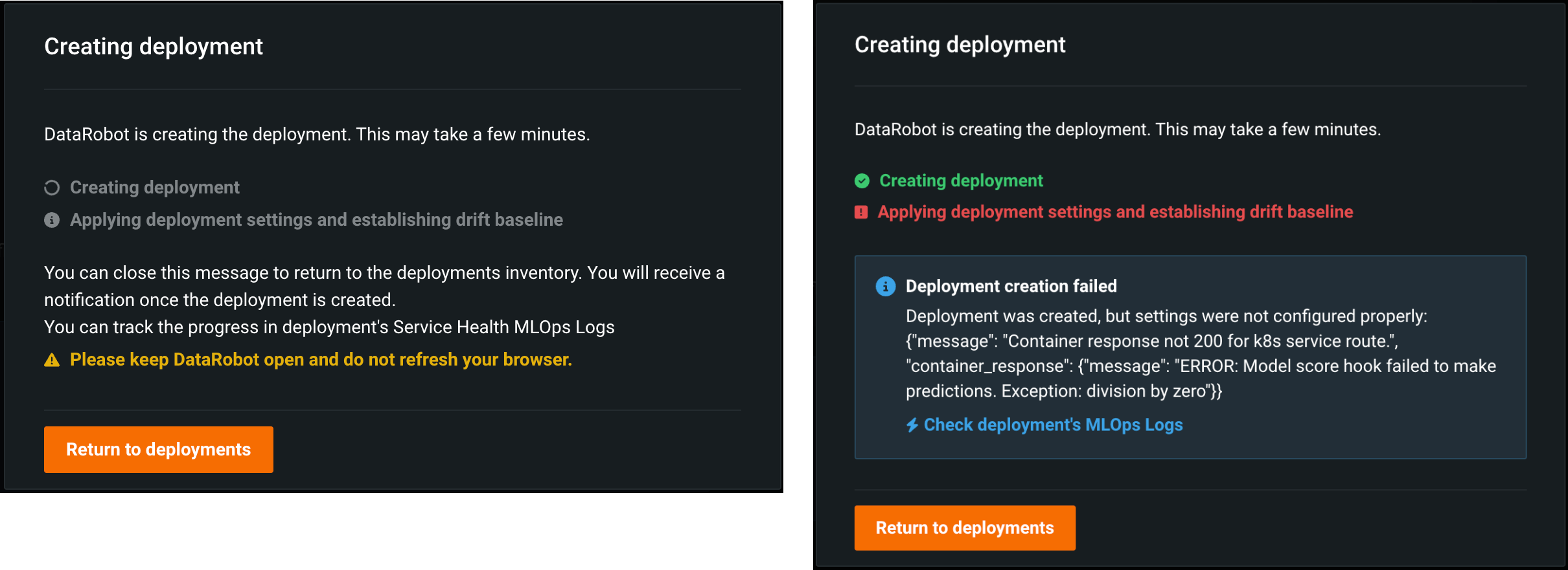 The custom model deployment process completed with errors. You may be unable to make predictions through this deployment; however, if you deactivate this deployment, you can't reactivate it until you resolve the deployment errors. You should check the MLOps Logs to troubleshoot the custom model deployment. |