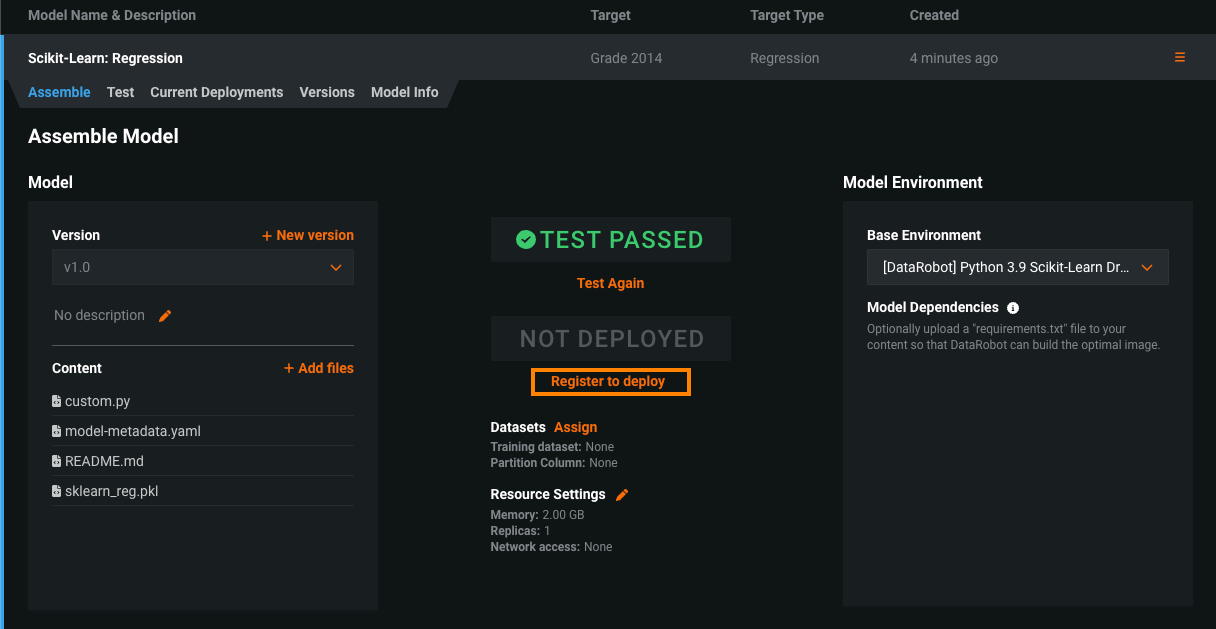 While you can deploy your custom inference model to an environment without testing, DataRobot strongly recommends your model pass testing before deployment.