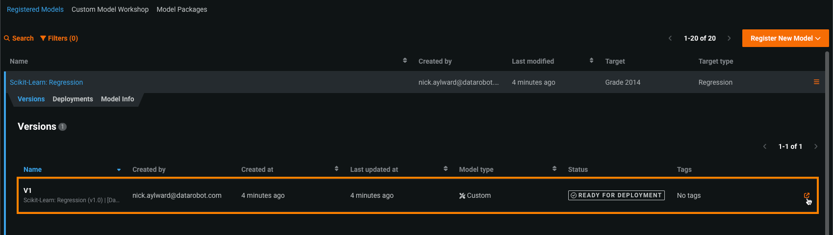On the Registered Models page, click the registered model containing the model version you want to deploy.