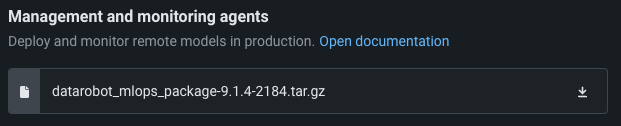 Access the management agent by downloading the MLOps agent tarball and installing it on the remote environment from which you are hosting models to make predictions. You can download it directly from the DataRobot application by clicking on your user icon and navigating to API keys and tools. Under the External Monitoring Agent header, click the download icon. The tarball appears in your browser's downloads bar when complete.