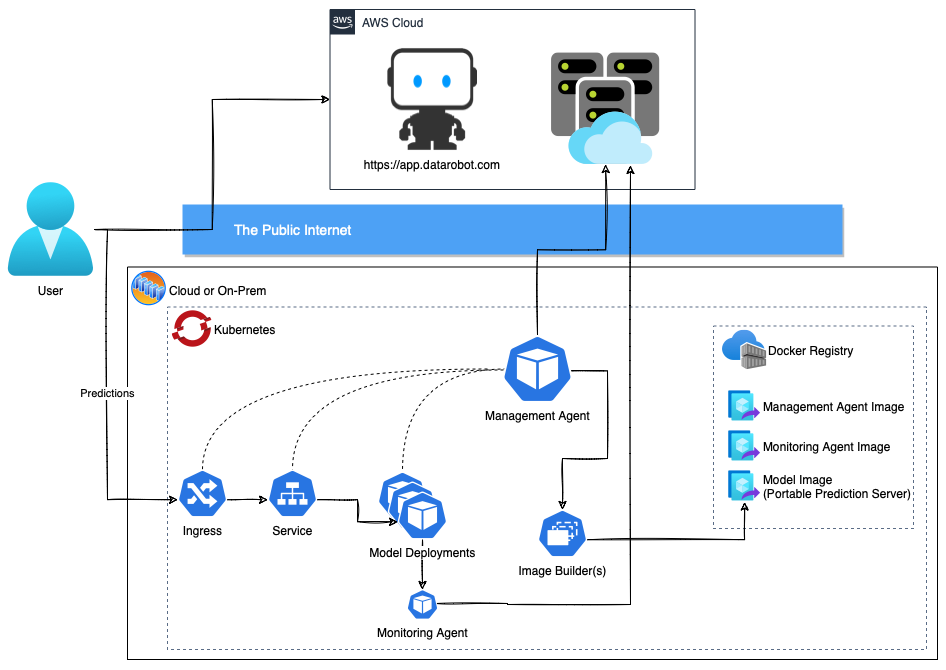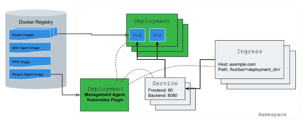 The diagram above shows a detailed view of how the management agent deploys models into Kubernetes and enables model monitoring.