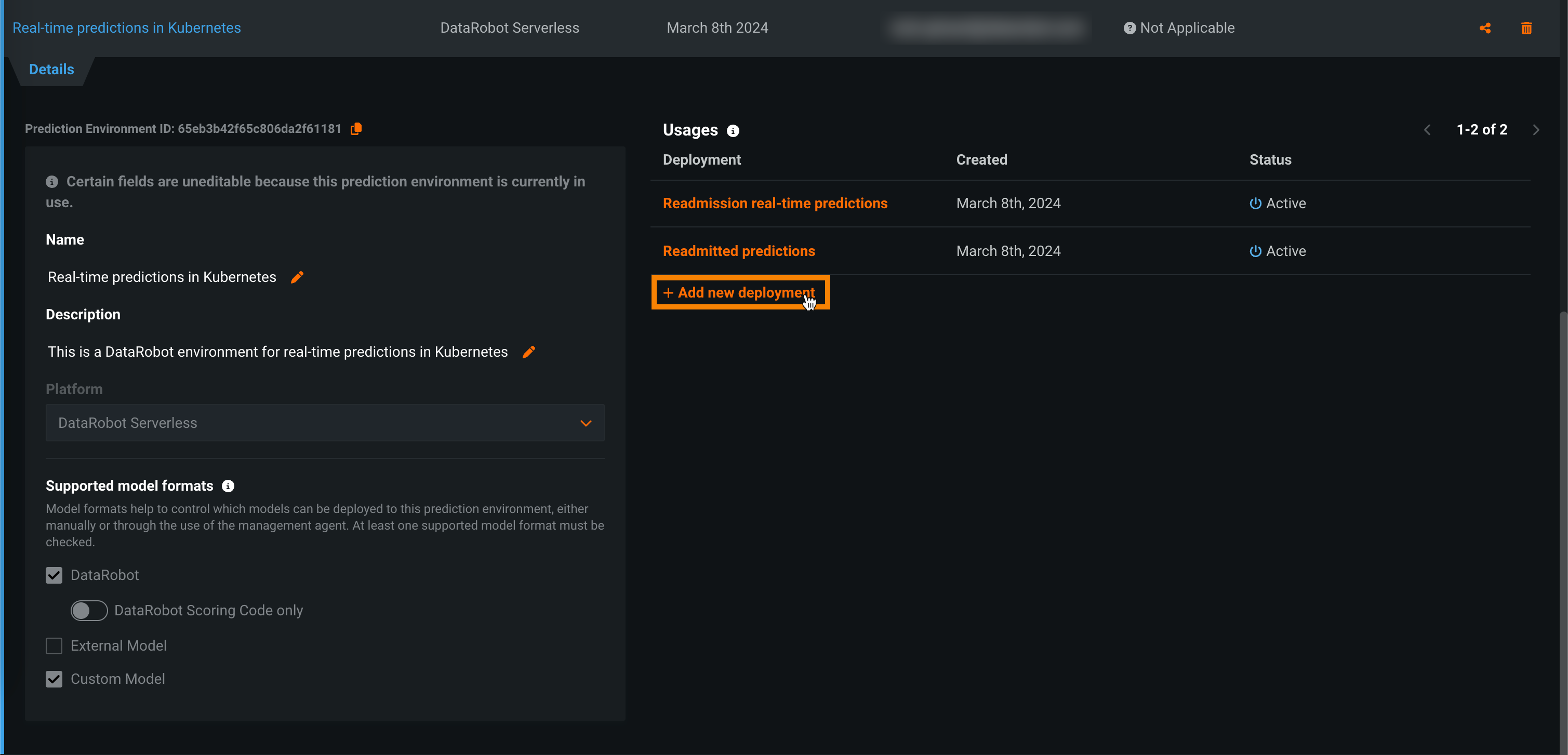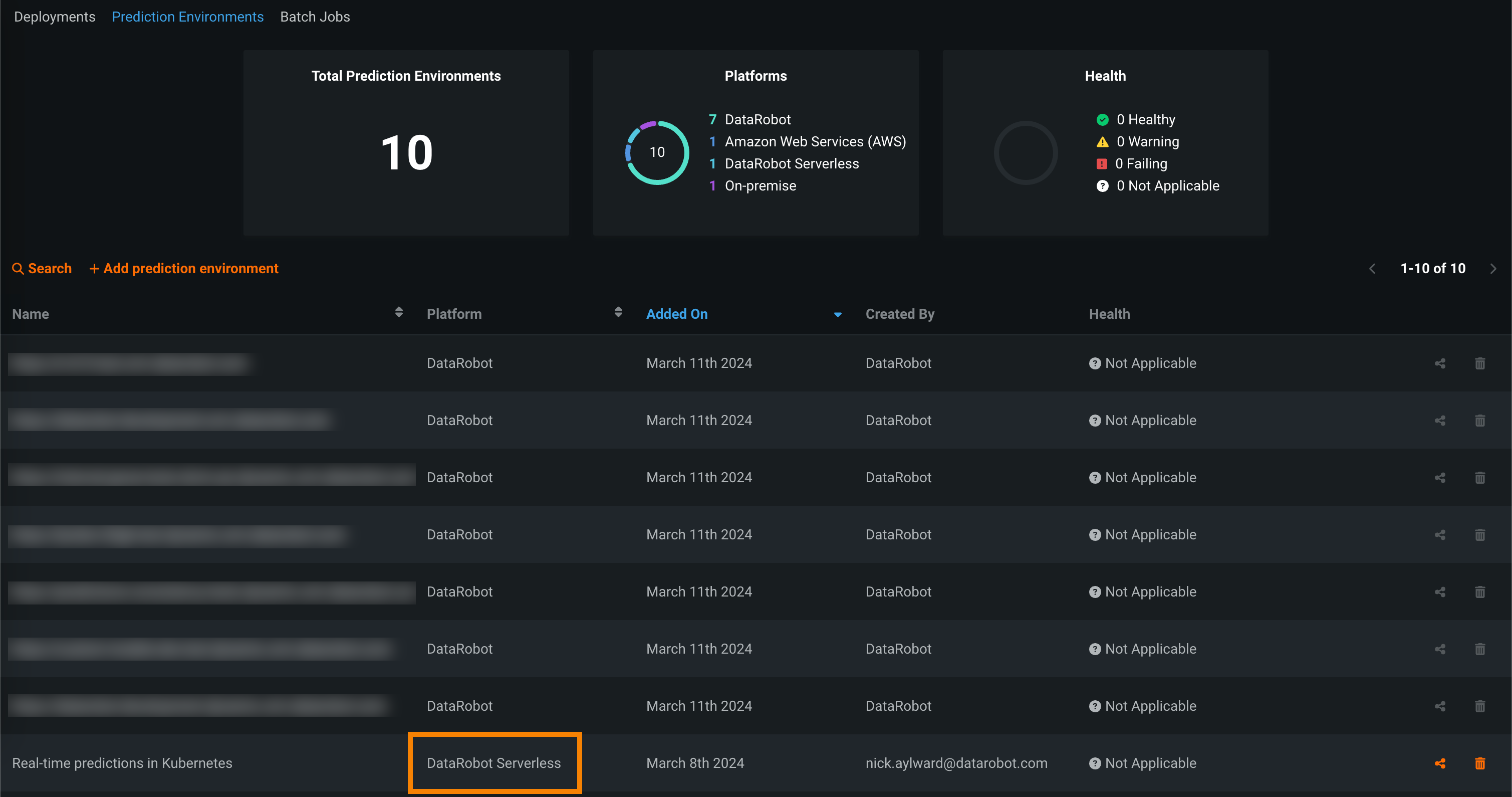 New Self-Managed organizations running DataRobot 10.2+ installations have access to a pre-provisioned DataRobot Serverless prediction environment on the Prediction Environments page.