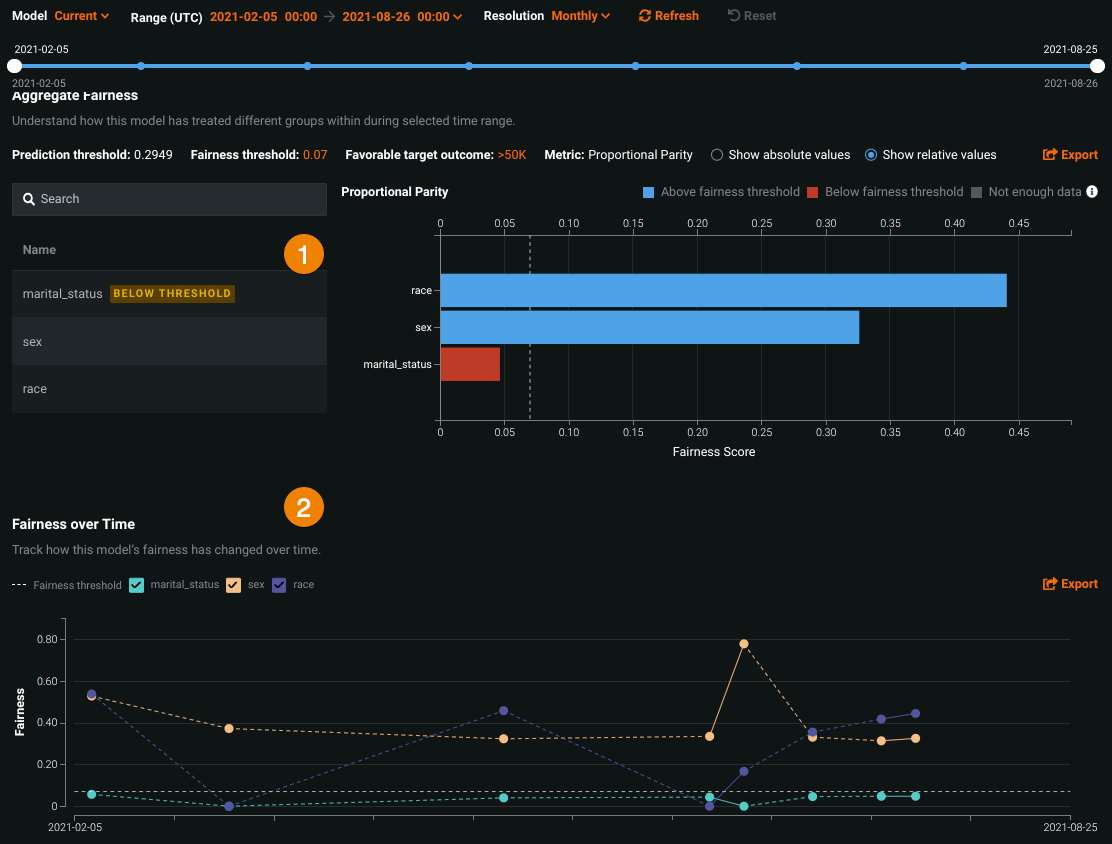 2 Fairness Over Time chart Illustrates how the distribution of a protected feature's fairness scores have changed over time.