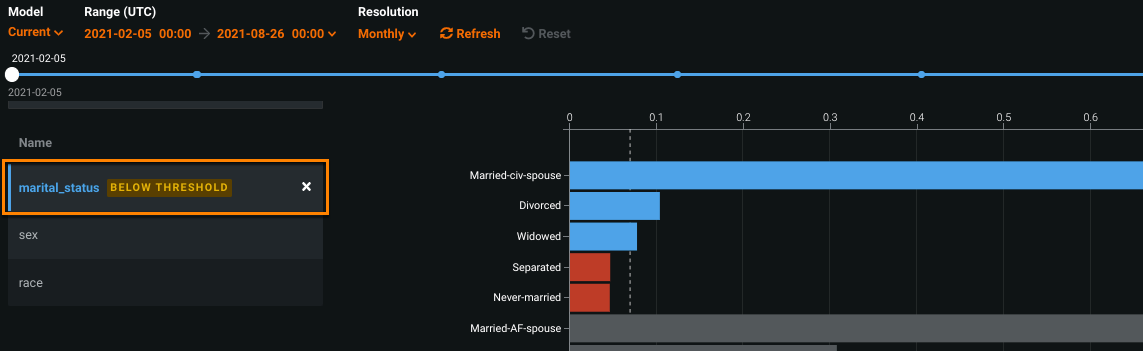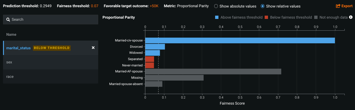 If a feature is marked as below threshold, the feature does not meet the predefined fairness conditions.