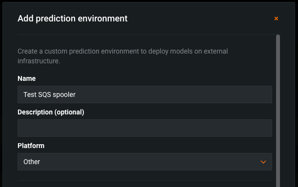 Field Description Name Enter a descriptive prediction environment name. Description (Optional) Enter a description of the external prediction environment. Platform Select the external platform on which the model is running and making predictions. -