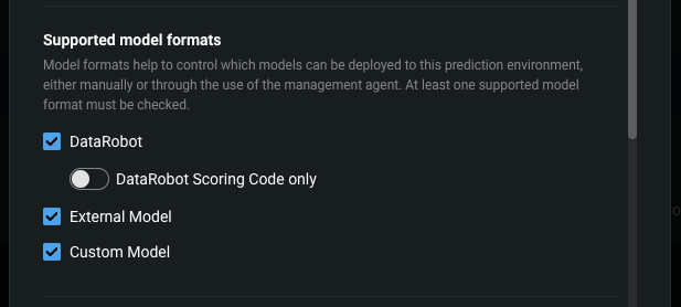 Under Supported model formats, select one or more formats to control which models can be deployed to the prediction environment, either manually or using the management agent. The available model formats are DataRobot or DataRobot Scoring Code only, External Model, and Custom Model.