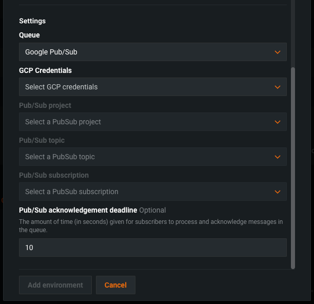 Field Description Pub/Sub project Select the Pub/Sub project used by the spooler. Pub/Sub topic Select the Pub/Sub topic used by the spooler; this should be the topic name within the project, not the fully qualified topic name path that includes the project ID. Pub/Sub subscription Select the Pub/Sub subscription name of the subscription used by the spooler. Pub/Sub acknowledgment deadline (Optional) Enter the amount of time (in seconds) for subscribers to process and acknowledge messages in the queue. After you configure the Queue settings you can provide any Environment variables accepted by the Google Pub/Sub spooler. For more information, see the Google Cloud Pub/Sub spooler reference.