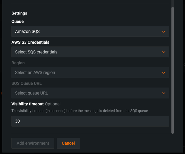 Field Description Region Select the AWS region used for the queue. SQS Queue URL Select the URL of the SQS queue used for the spooler. Visibility timeout (Optional) The visibility timeout before the message is deleted from the queue. This is an Amazon SQS configuration not specific to the monitoring agent. After you configure the Queue settings you can provide any Environment variables accepted by the Amazon SQS spooler. For more information, see the Amazon SQS spooler reference.