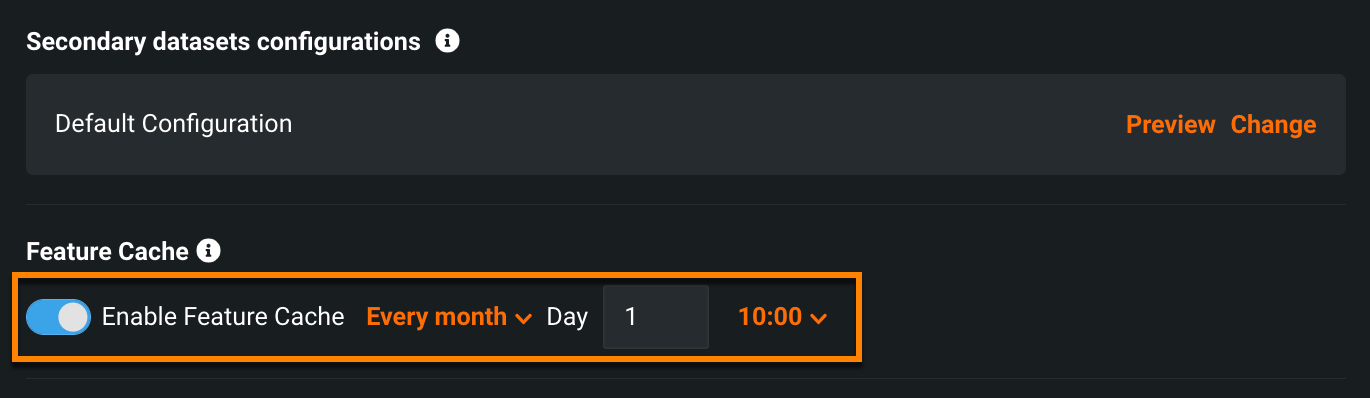 If you are configuring the settings for a new deployment, the creation process may take longer than usual as features are computed and stored for the first time during deployment creation. Once feature cache is enabled for a deployment, it cannot be disabled later on.