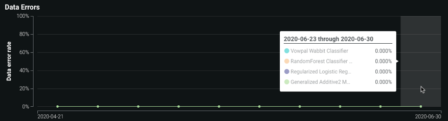 The Data Errors chart records the data error rate for each model over time. Data error rate measures the percentage of requests that result in a 4xx error (problems with the prediction request submission).