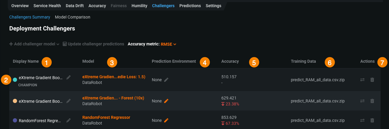 | 1 | Display Name | The display name for each model. Use the pencil icon to edit the display name. This field is useful for describing the purpose or strategy of each challenger (e.g., "reference model," "former champion," "reduced feature list"). |