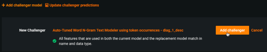 DataRobot verifies that the model shares features and a target type with the champion model. Once verified, click Add Challenger. The model is now added to the deployment as a challenger.