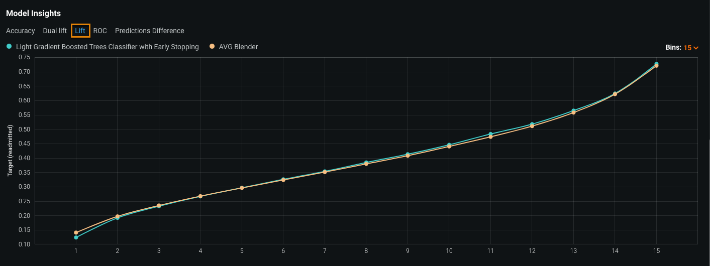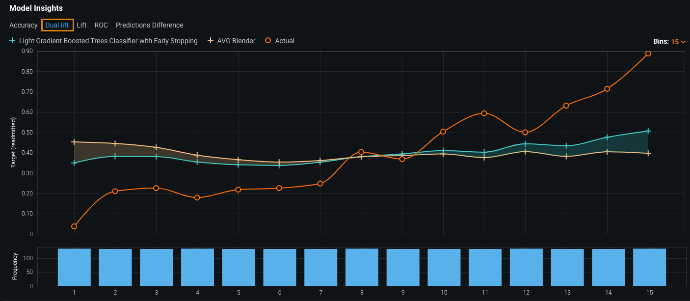 A dual lift chart is a visualization comparing two selected models against each other. This visualization can reveal how models underpredict or overpredict the actual values across the distribution of their predictions. The prediction data is evenly distributed into equal size bins in increasing order.