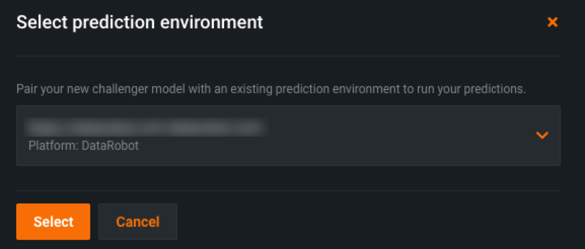 Select a model package for the challenger you want to add (custom and DataRobot models only). Additionally, you must indicate a prediction environment used by the model package; this details where the model runs predictions. DataRobot or custom model can only use a DataRobot prediction environment for challengers models (unlike the champion model, deployed to an external prediction environment). When you have chosen the desired prediction environment, click Select.