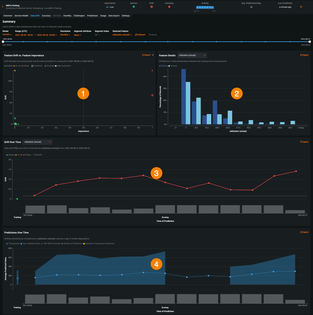 | 5 | Selected Feature | Sets the feature displayed on the Feature Details chart and the Drift Over Time chart. |