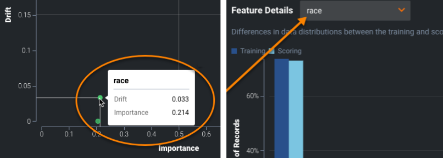 To use the chart, select a feature from the dropdown. The list, which defaults to the target feature, includes any of the features tracked. Click a point in the Feature Drift vs. Feature Importance chart: