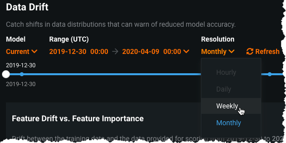 By default, the slider is set to display the same date range that is used to calculate and display drift status. For example, if drift status captures the last week, then the default slider range will span from the last week to the current date.