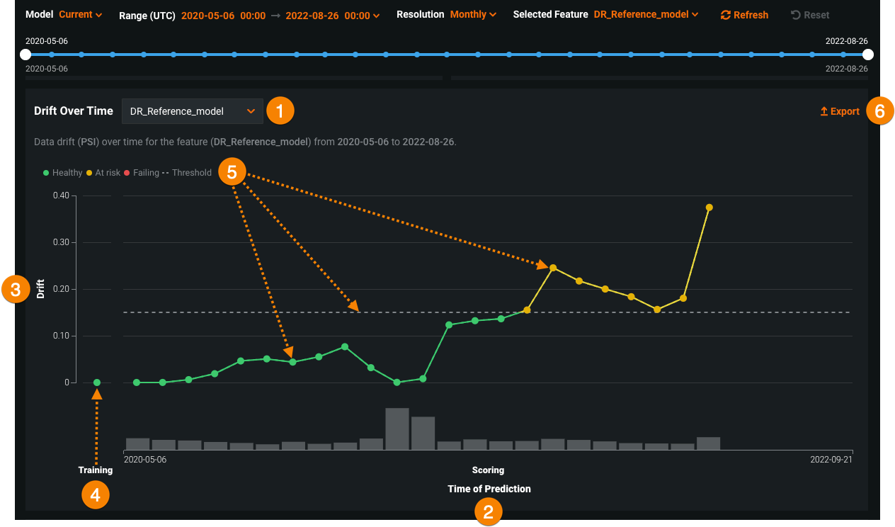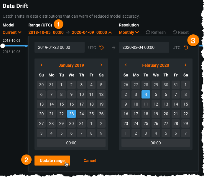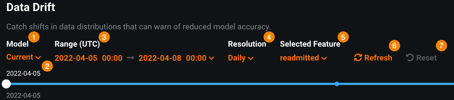 | 1 | Reference period | Sets the date range of the period to use as a baseline for the drift comparison charts. |