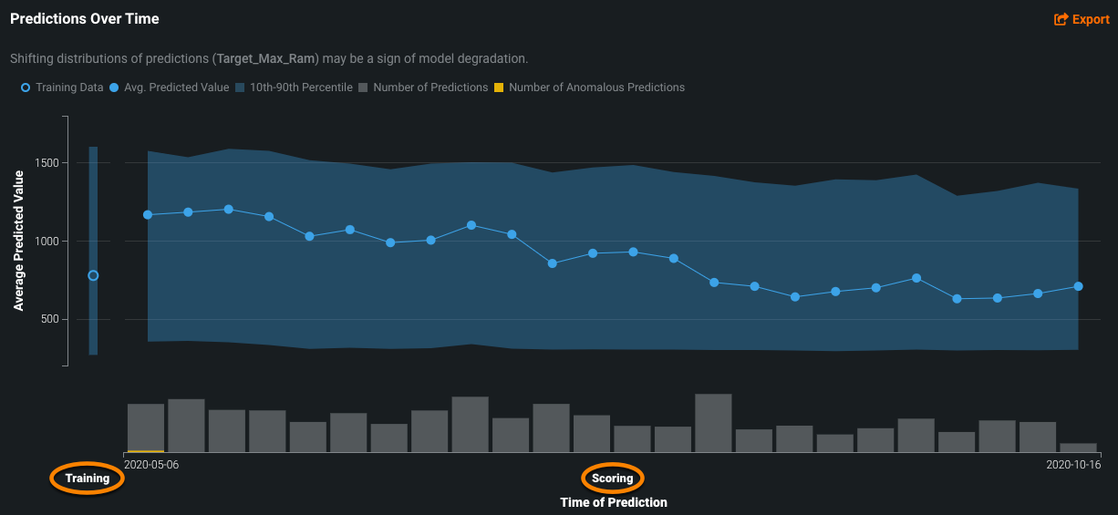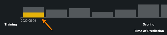 Additionally, both charts have Training and Scoring labels across the X-axis. The Training label indicates the section of the chart that shows the distribution of predictions made on the holdout set of training data for the model. It will always have one point on the chart. The Scoring label indicates the section of the chart showing the distribution of predictions made on the deployed model. Scoring indicates that the model is in use to make predictions. It will have multiple points along the chart to indicate how prediction distributions change over time.