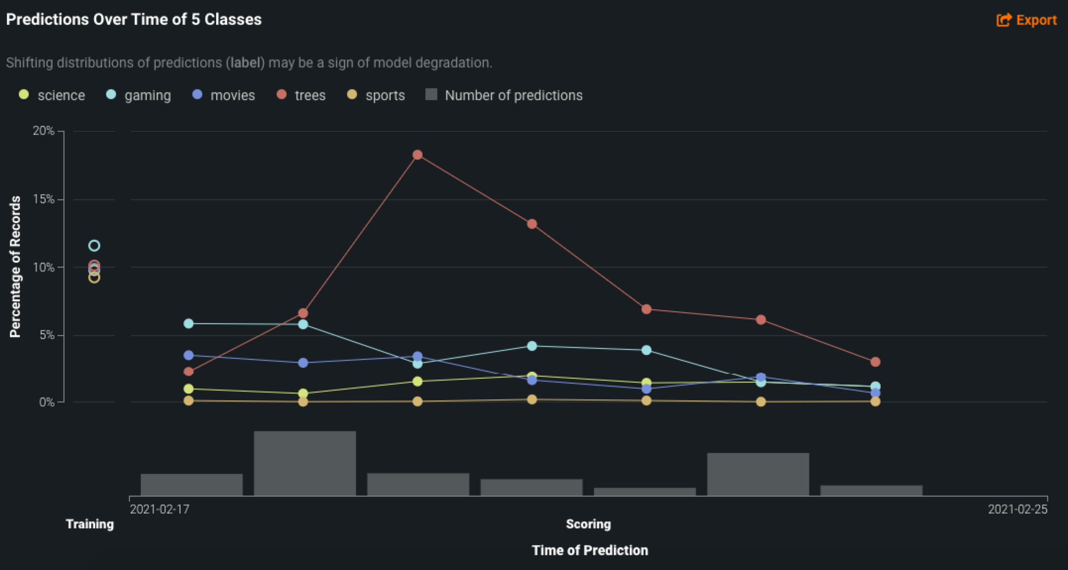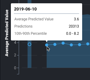 The Predictions Over Time chart provides an at-a-glance determination of how the model's predictions have changed over time. For example: