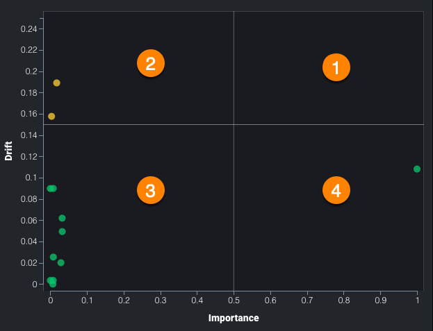 The quadrants represented in the chart help to visualize feature-by-feature data drift plotted against the feature's importance. Quadrants can be loosely interpreted as follows: