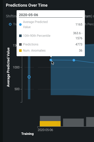 To view the number of anomalous predictions for a specific time period, hover over the point on the plot corresponding to the flagged predictions in the bar chart.