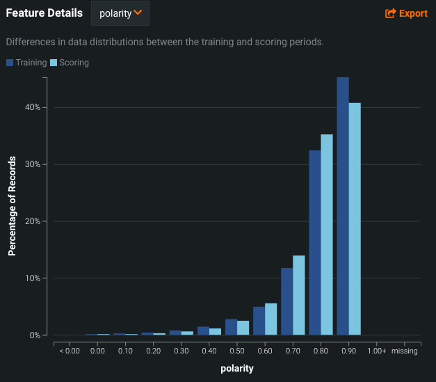 The Feature Details chart provides a histogram that compares the distribution of a selected feature in the training data to the distribution of that feature in the inference data.