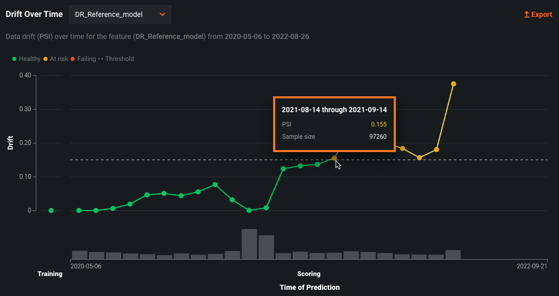 Represents the time range of the predictions used to calculate the corresponding drift value (PSI). Below the X-axis, the Prediction sample size bar chart represents the number of predictions made during the corresponding prediction time range. |