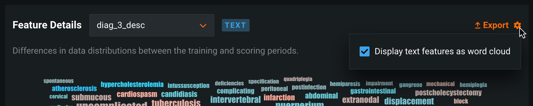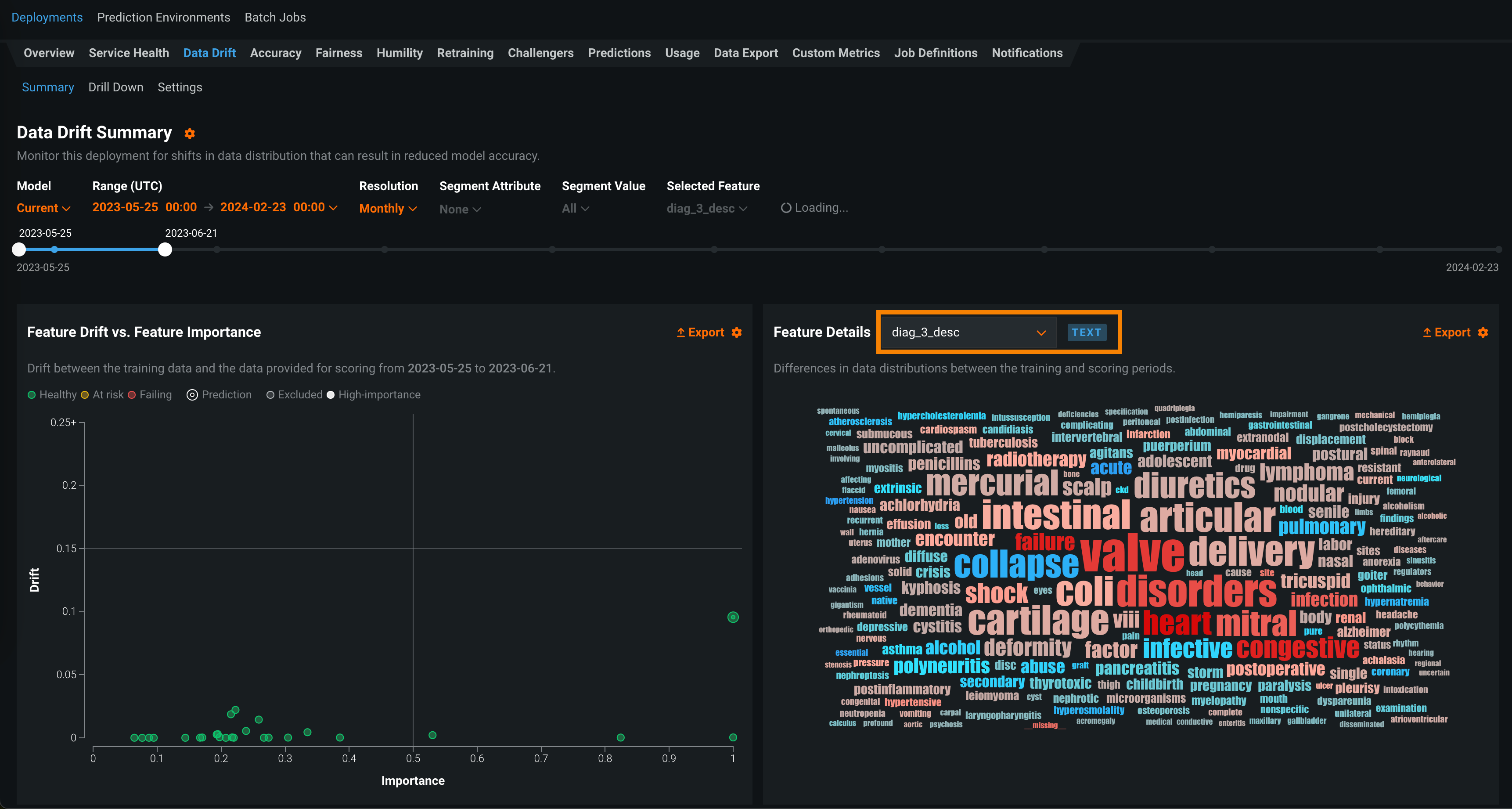 For text features, the Feature Details chart replaces the feature drift bar chart with a word cloud visualizing data distributions for each token and revealing how much each individual token contributes to data drift in a feature.