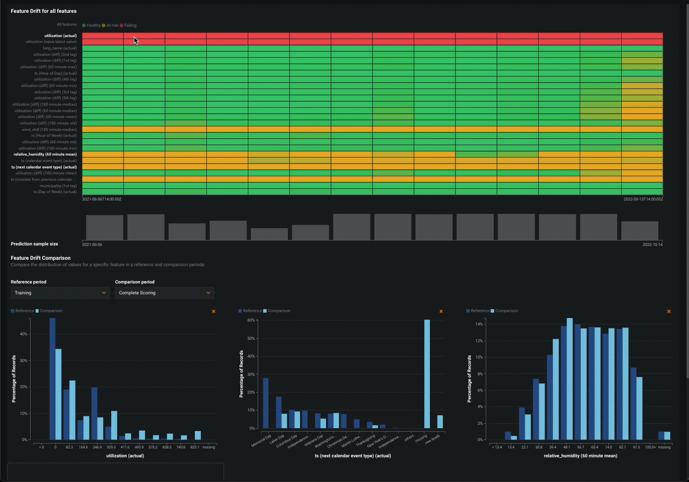 Because data drift can decrease your model's predictive power, determining when a feature started drifting and monitoring how that drift changes (as your model continues to make predictions on new data) can help you estimate the severity of the issue. Using the Drill Down tab, you can compare data drift heat maps across the features in a deployment to identify correlated drift trends. In addition, you can select one or more features from the heat map to view a Feature Drift Comparison chart, comparing the change in a feature's data distribution between a reference time period and a comparison time period to visualize drift. This information helps you identify the cause of data drift in your deployed model, including data quality issues, changes in feature composition, or changes in the context of the target variable.