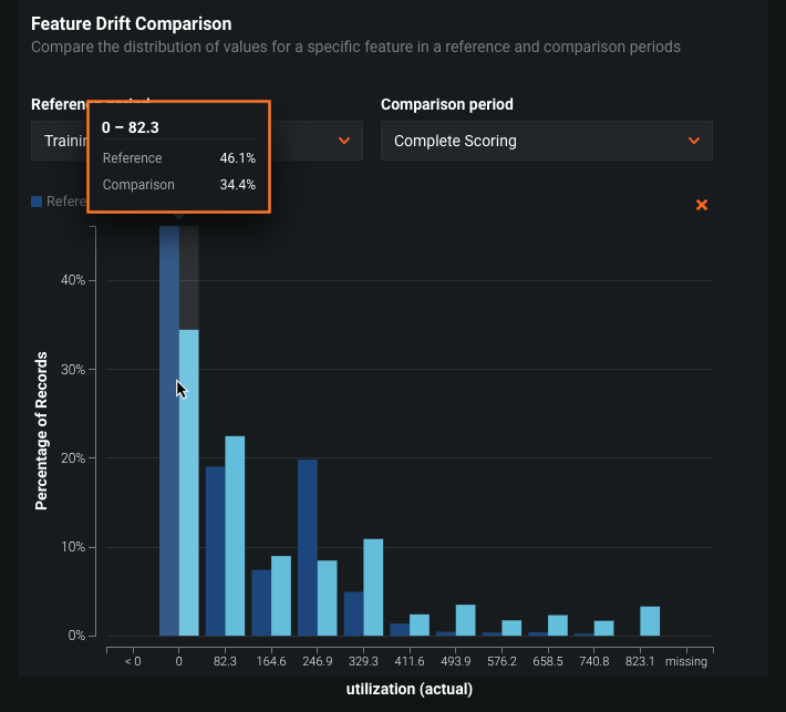 To view additional information on a Feature Drift Comparison chart, hover over a bar in the chart to see the range of values contained in that bar, the percentage of the total dataset those values represent in the Reference period, and the percentage of the total dataset those values represent in the Comparison period: