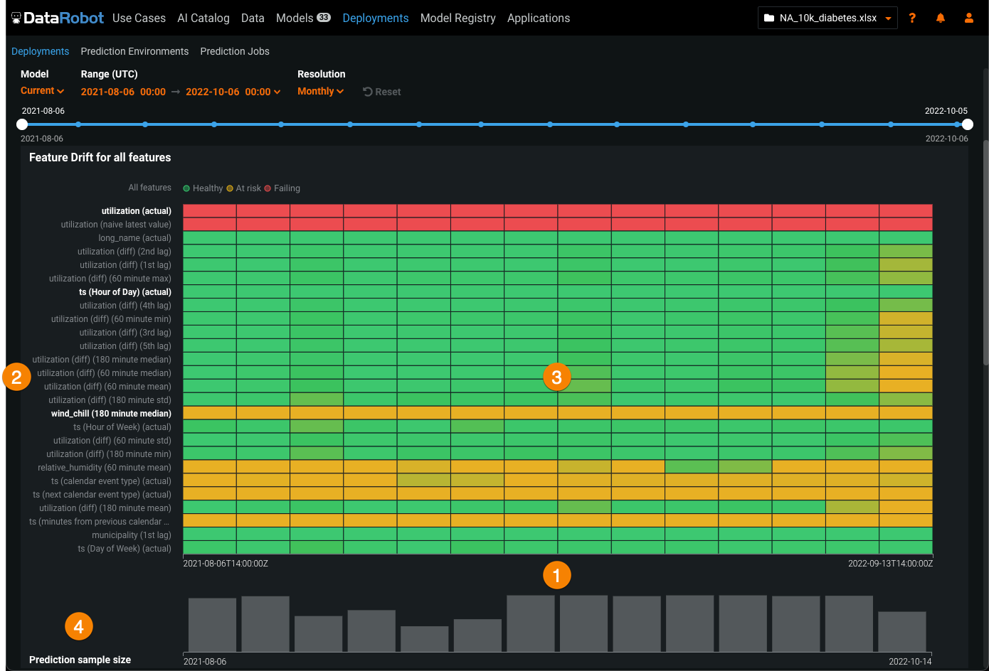 | 3 | Status heat map | Displays the drift status over time for each of a deployment's features. Drift status visualizations are based on the monitoring settings configured by the deployment owner. The deployment owner can also set the drift and importance thresholds in the Feature Drift vs Feature Importance chart settings. The possible drift status classifications are: