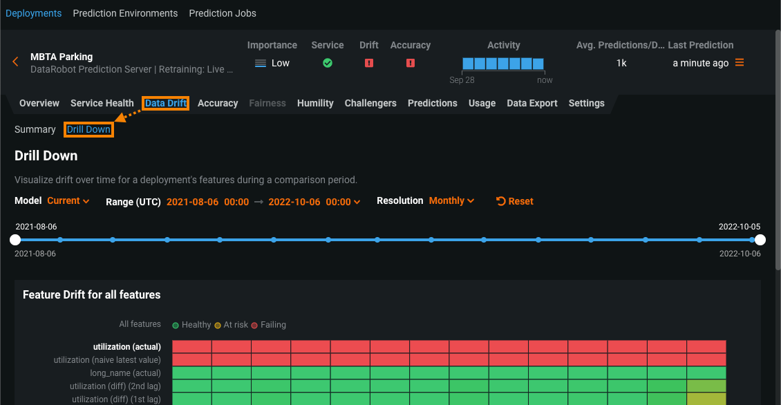 The Range and Resolution dropdowns help diagnose deployment issues by allowing you to change the granularity of the three deployment monitoring tabs: Data Drift, Service Health, and Accuracy.