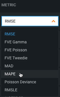 | Regression | RMSE, MAE, Gamma Deviance, Tweedie Deviance, R Squared, FVE Gamma, FVE Poisson, FVE Tweedie, Poisson Deviance, MAD, MAPE, RMSLE |