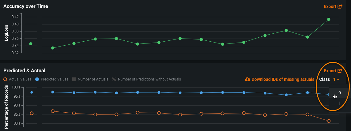 For a binary classification project, the timeline and bucketing work the same as for regression projects, but with this project type, you can select the class to display results for (as described in the Accuracy over Time graph above).